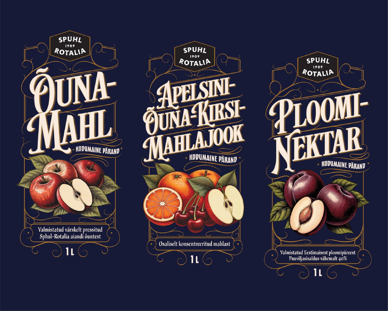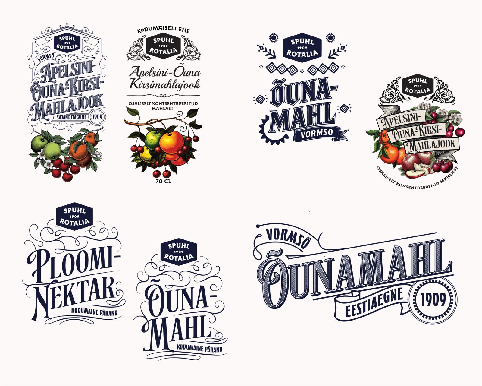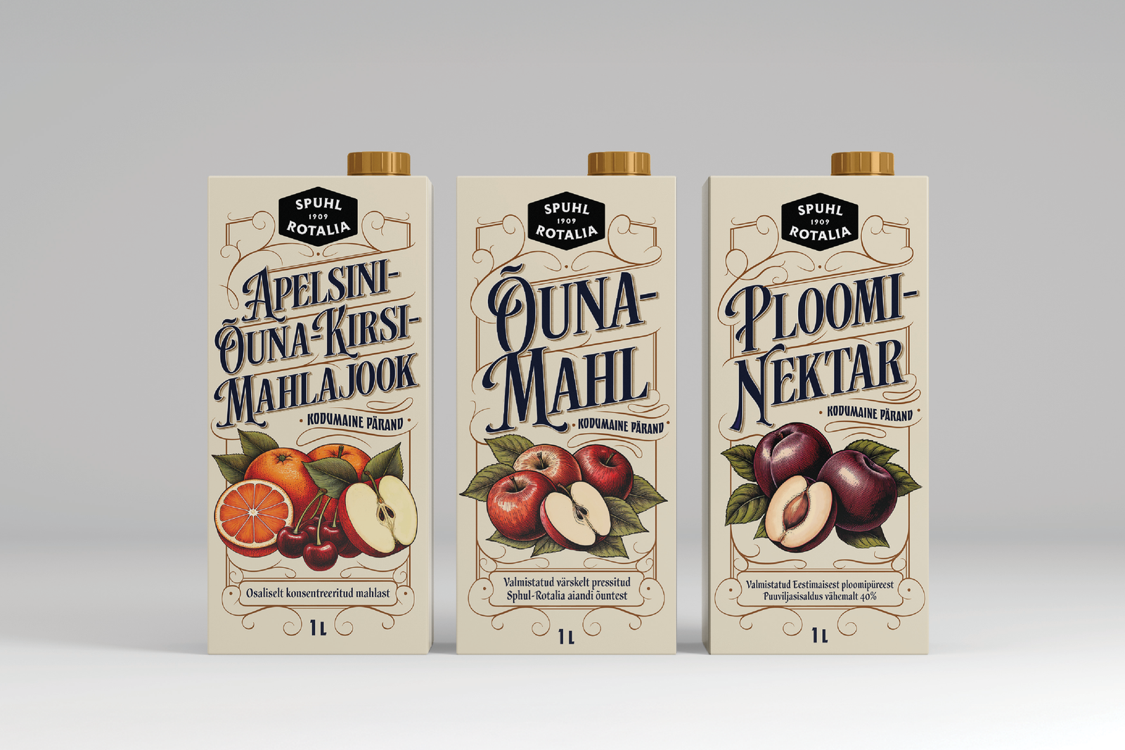 The brief was to make juice packages to a vintage Estonian brand Spuhl-Rotalia, that was once a major fruit orchard in 20th-century Estonia. I chose ornamental-lettering as the visual style, to highlight the brand’s vintage essence.